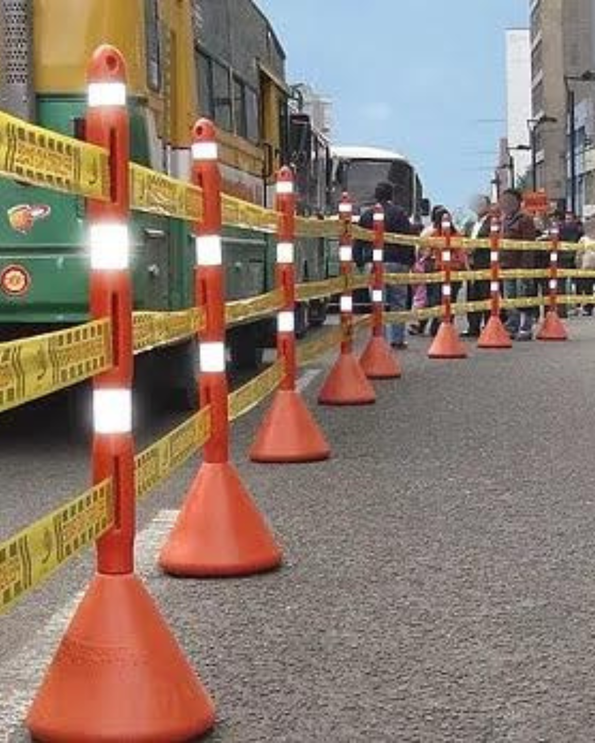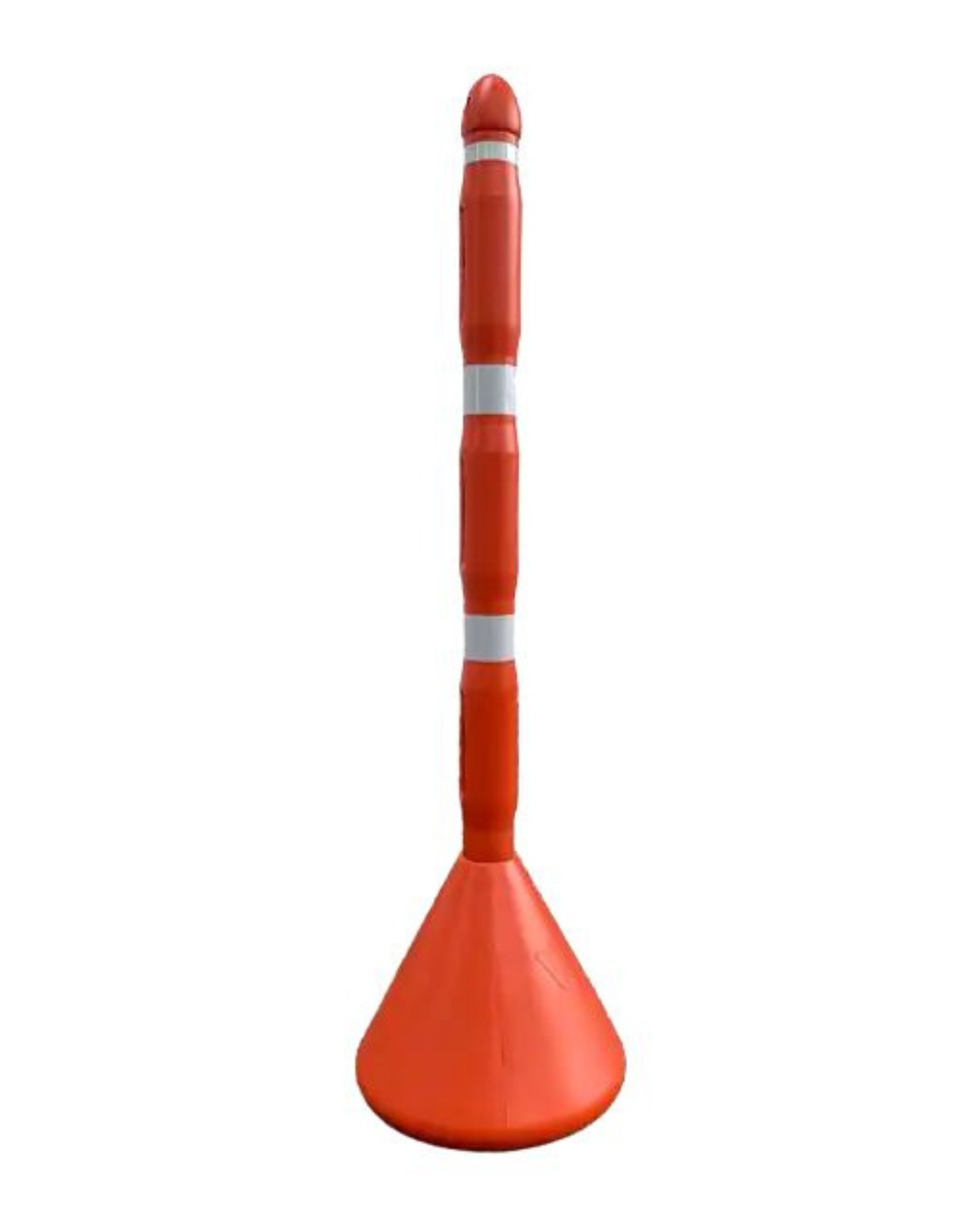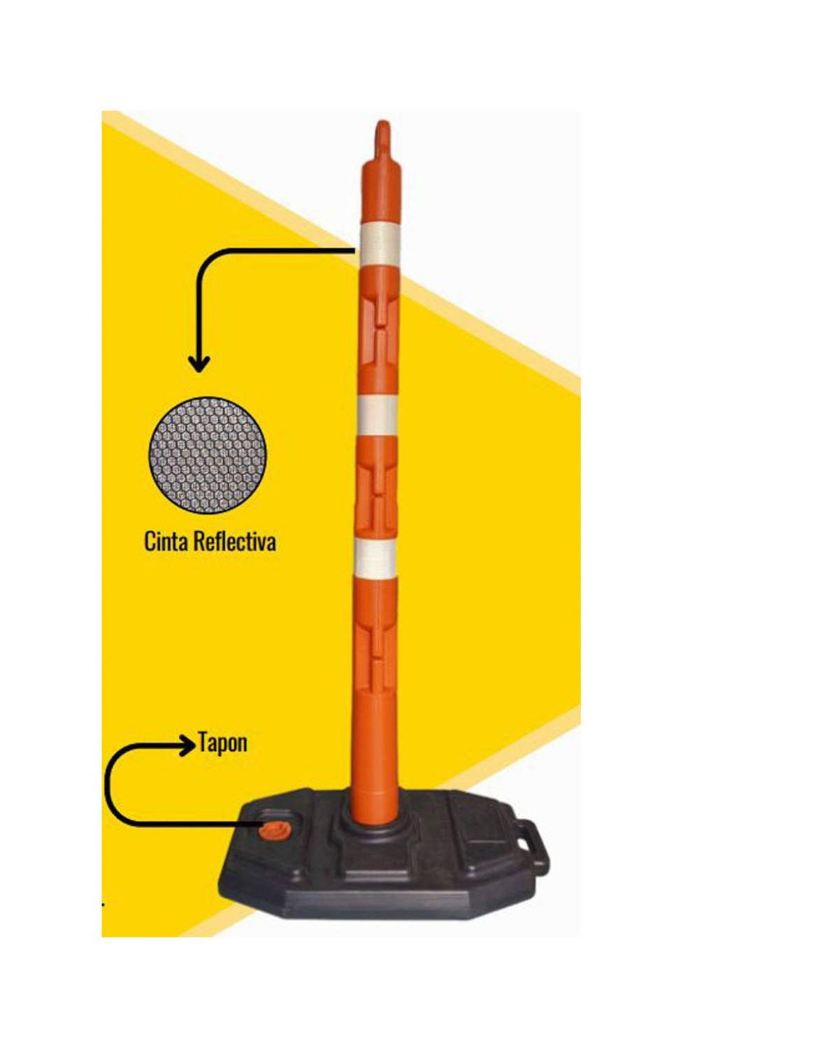 Cilindro de señalización en plástico de alta resistencia. Su diseño estable y visible permite delimitar flujos peatonales y vehiculares. Puede incluir bandas reflectivas para mayor seguridad en baja visibilidad.