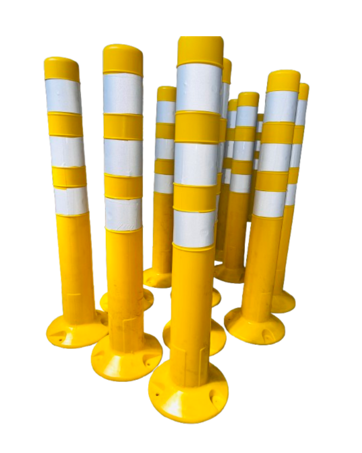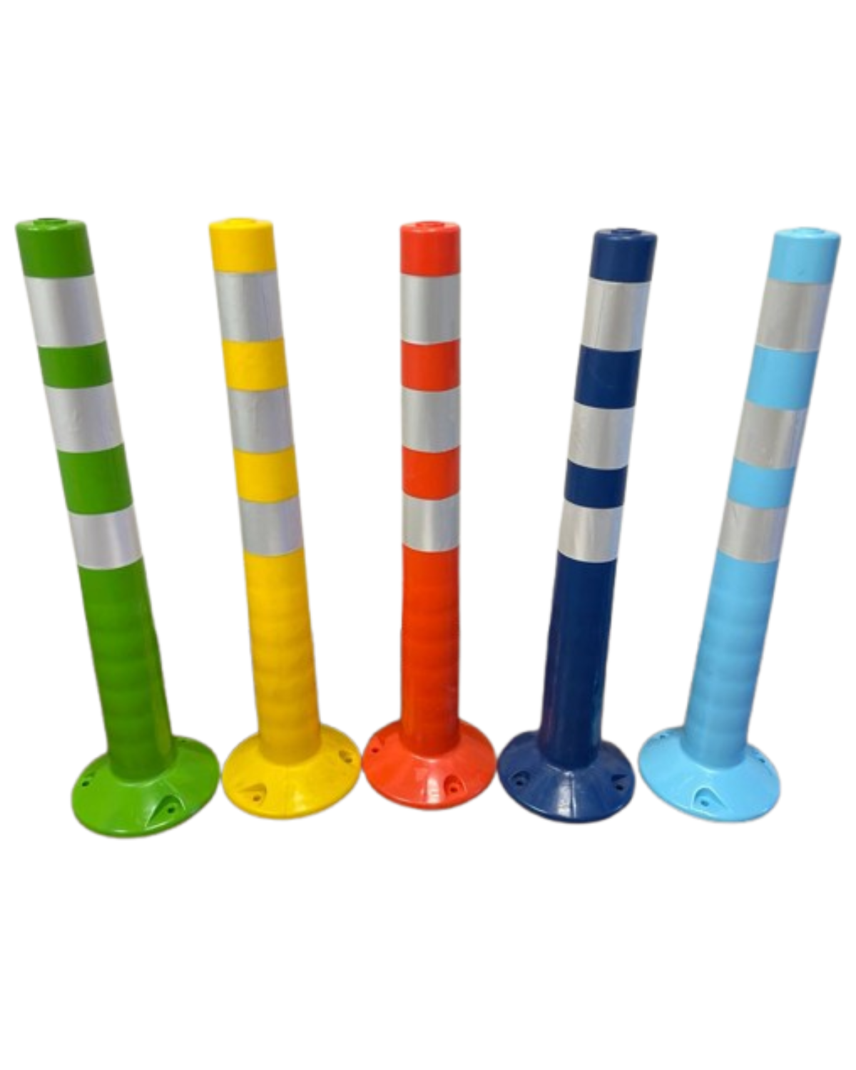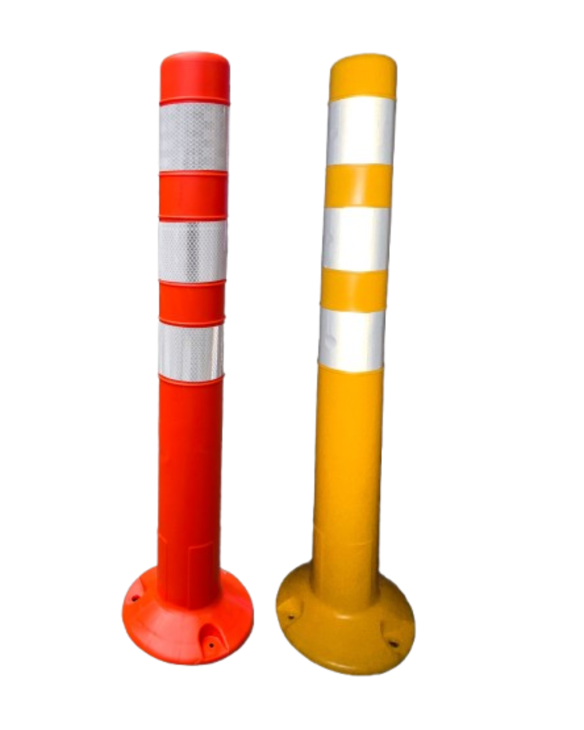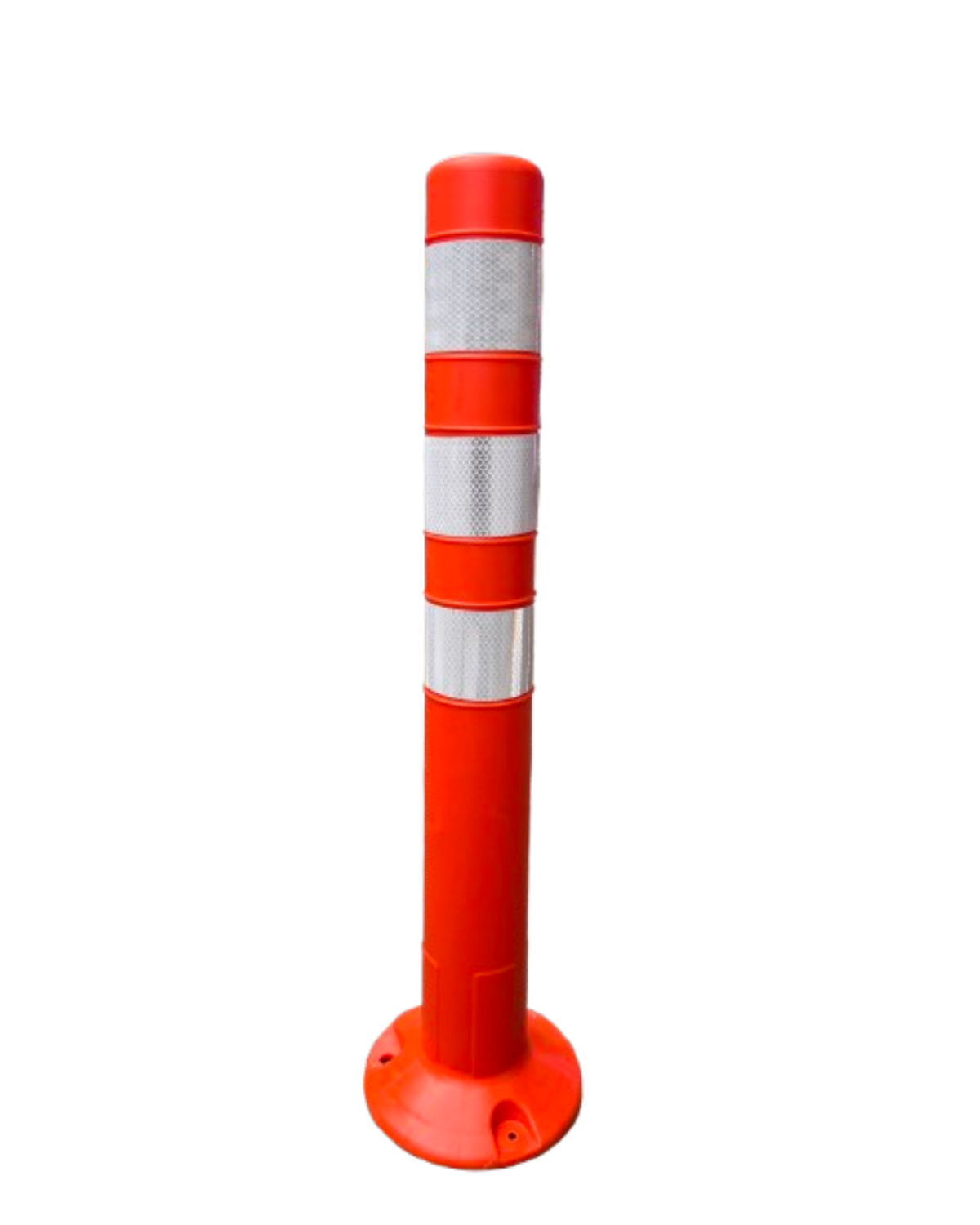Poste vial en PVC flexible con memoria de forma tras impactos. Equipado con tres franjas reflectivas de alta intensidad, mejora la visibilidad y seguridad en ciclorutas, bifurcaciones y delimitación vial.